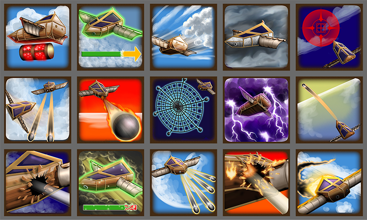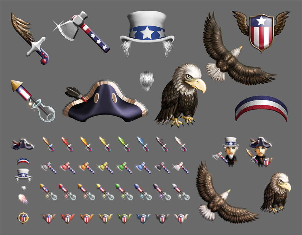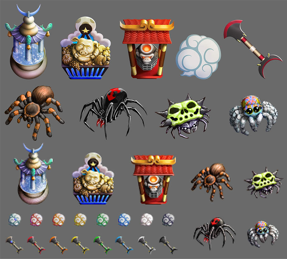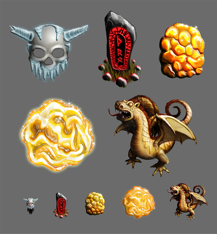 Mobile gaming assets for PerBlue Inc., including hi res paintings, pixel art, UI design and marketing materials.